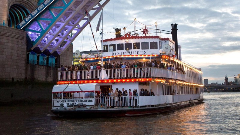 Wow up to 620 guests with the enchanting and ever-changing backdrop of London's famous sights while cruising aboard this large replica 19th century paddle steamer. When embarking or disembarking at Tower Pier, your guests will marvel as Tower Bridge is raised for the Dixie Queen to pass, momentarily bringing London's busy traffic to a halt. Cruise on past Canary Wharf and historic Greenwich, round The O2 peninsula and through the Thames Barrier.